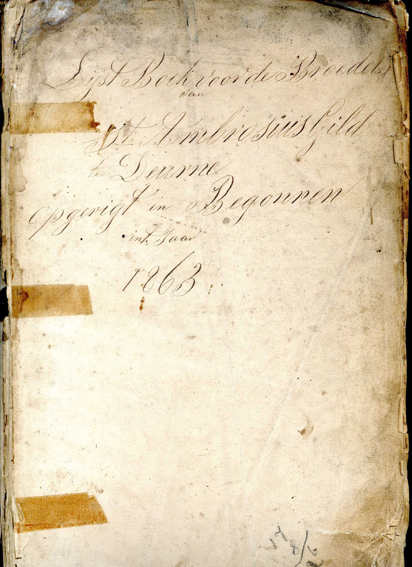 Het eerste ledenboek dat we in onze archieven tegenkwamen heeft als titelpagina: ‘Lijstboek voor de Broeders St. Ambrosisusgilde Deurne, Opgericht en Begonnen in het Jaar 1863’.